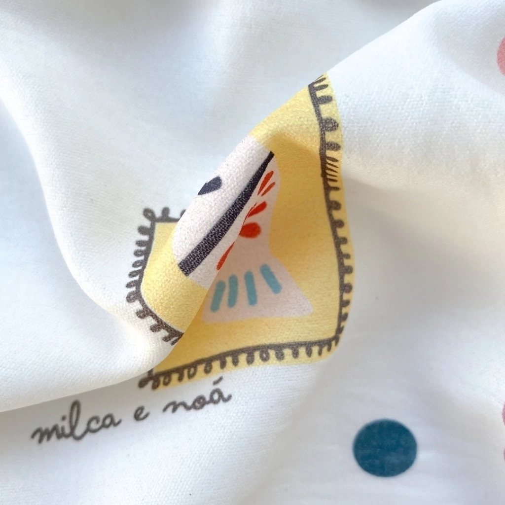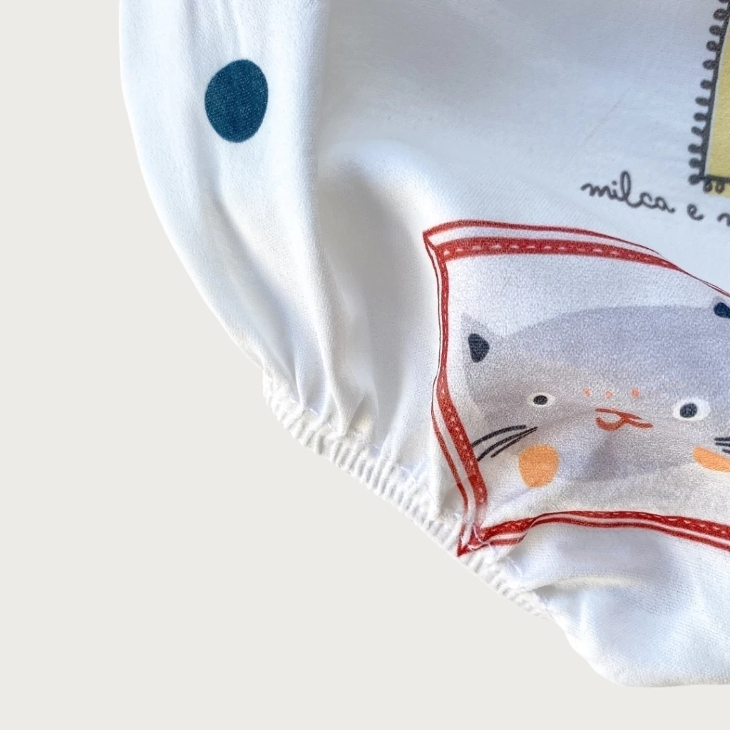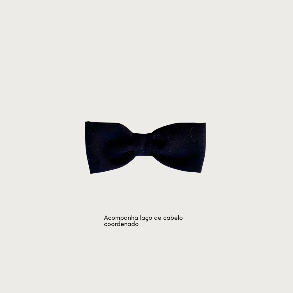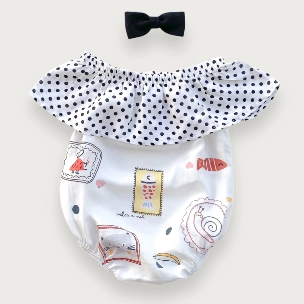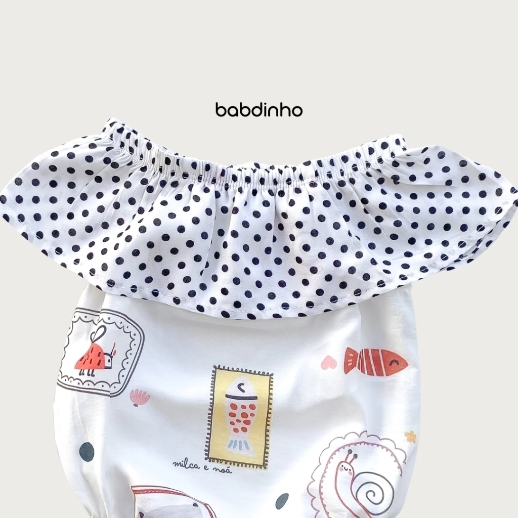 Confeccionado em crepe com elastado e babado de viscose, tecidos macios e fresquinhos, é ideal para os dias mais quentes. Possui botões de pressão na parte inferior, garantindo praticidade nas trocas, e acompanha um laço de cabelo combinando, que completa o look com um toque especial.