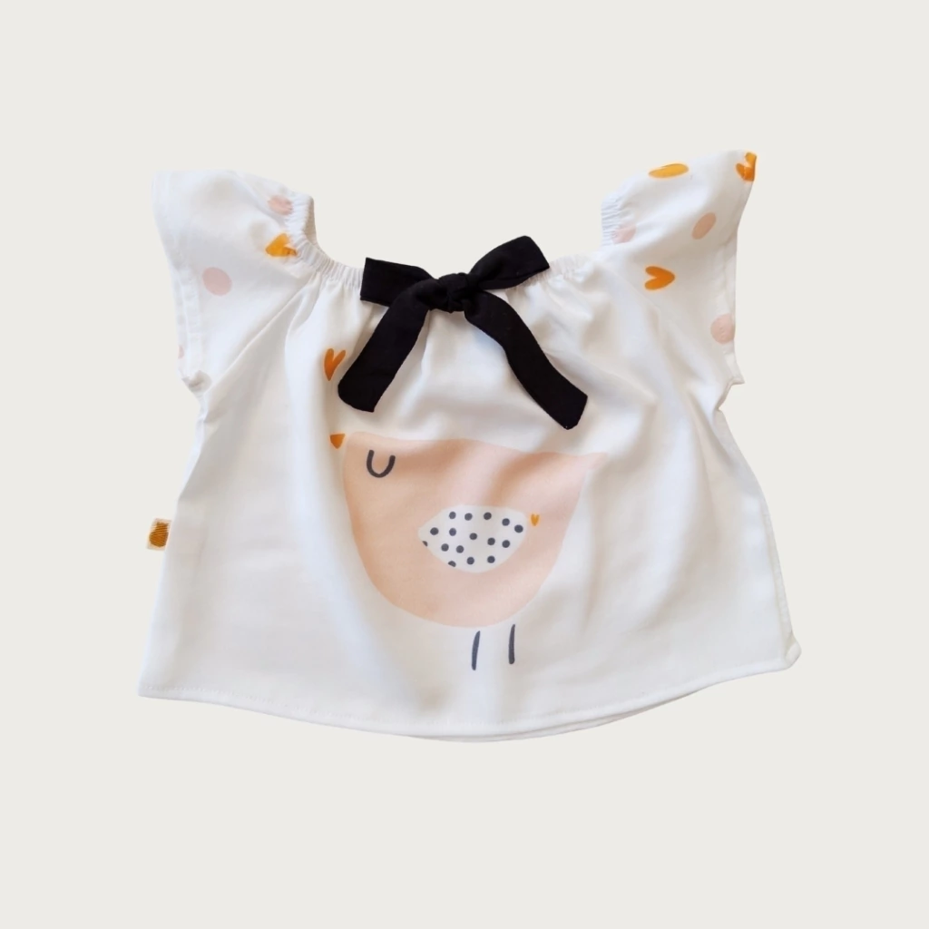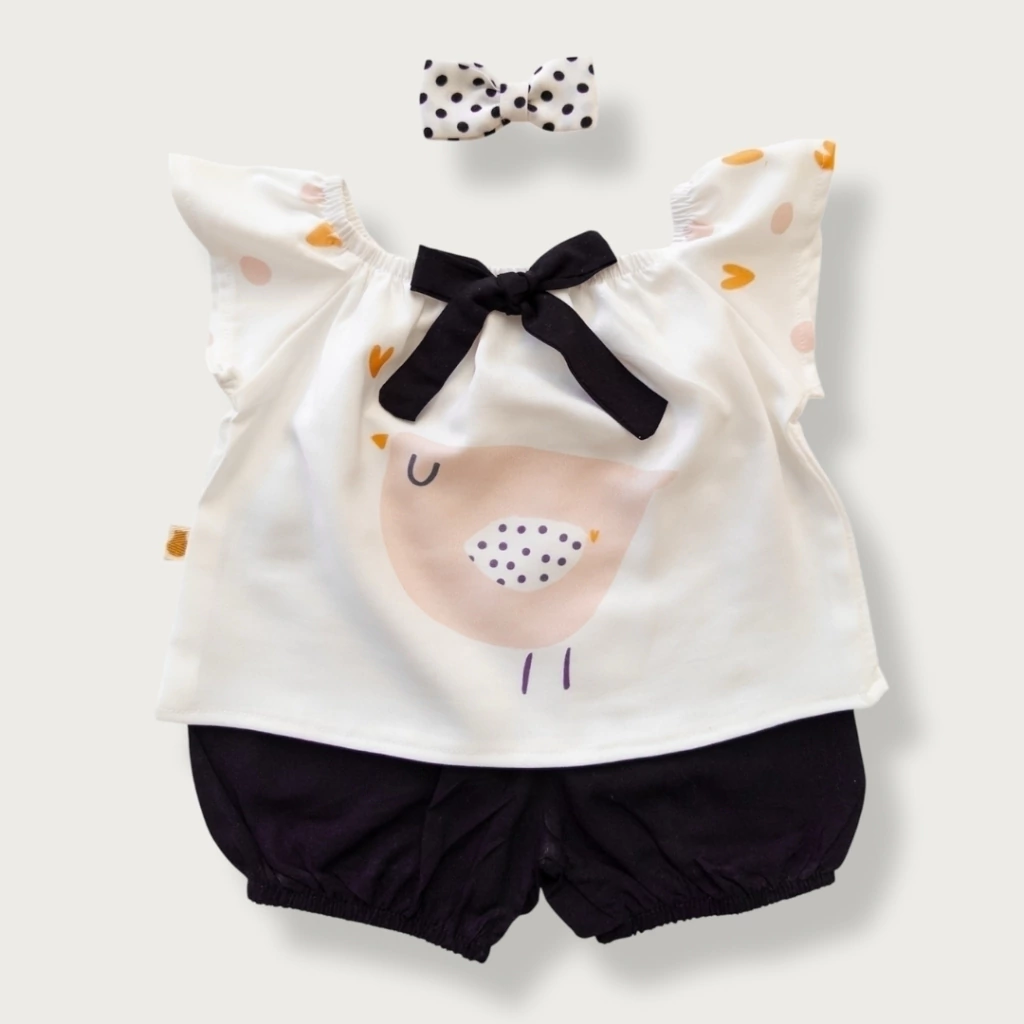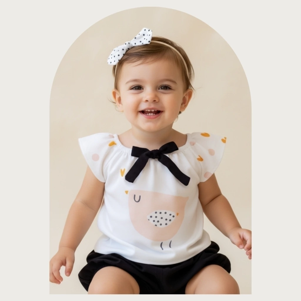Nosso conjunto é feito para vestir a infância com doçura e poesia. A blusinha traz a estampa exclusiva de um passarinho cheio de ternura, acompanhada por um laço delicado em preto que dá um toque sofisticado e atemporal. O shortinho soltinho em tecido leve completa o visual com muito conforto, garantindo liberdade para brincar, explorar e se encantar.