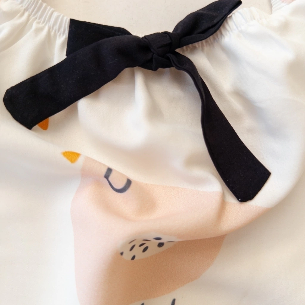 Um conjuntinho cheio de ternura, com estampa exclusiva, laço encantador e muito conforto para acompanhar os momentos mais doces da infância