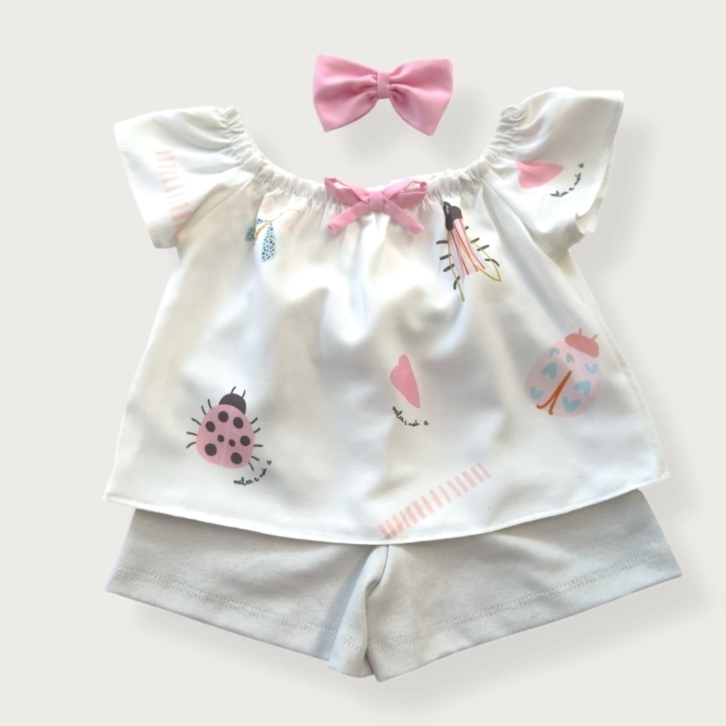 A blusinha traz uma estampa exclusiva com pequenos insetos em tons suaves e pastel uma homenagem à beleza da diversidade. Cada detalhe foi pensado com carinho: do lacinho delicado à modelagem soltinha do short em cotton cinza, que garante liberdade para brincar e explorar o mundo com alegria.