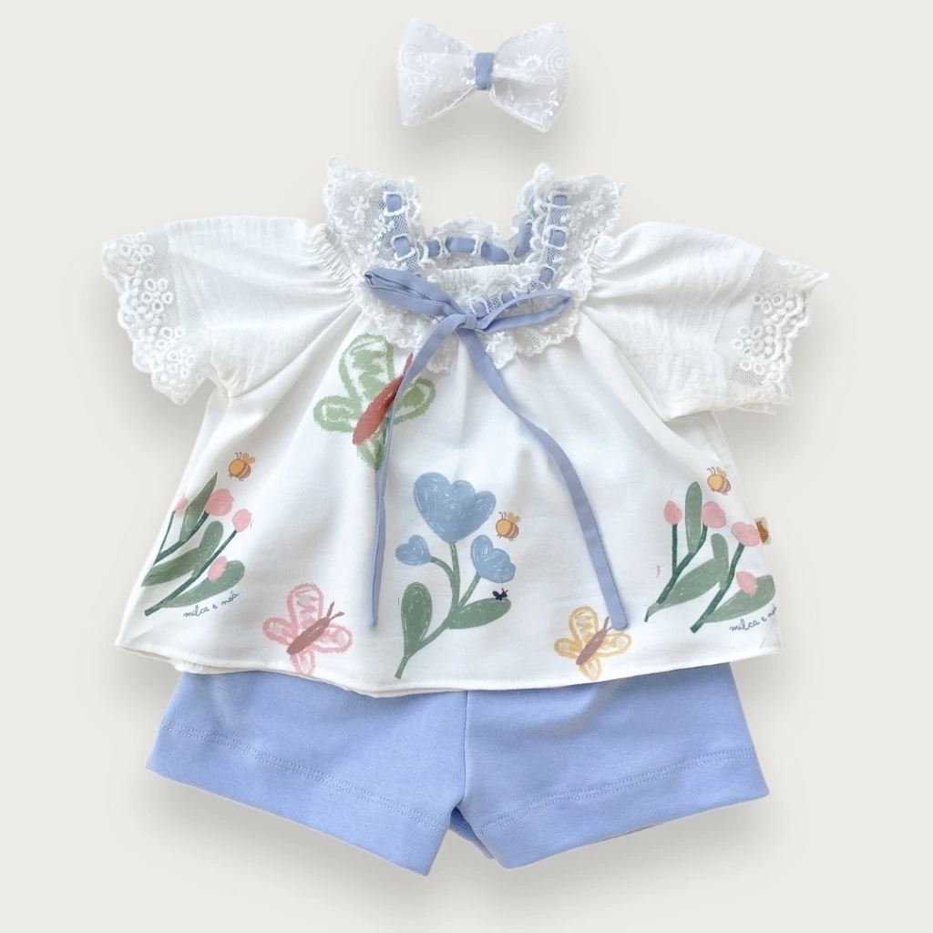 A blusinha bata recebe uma estampa exclusiva inspirada nos jardins encantados, com flores, borboletas e abelhinhas pintadas com afeto. O toque romântico fica por conta dos bicos de algodão aplicados nas manguinhas e na gola, que finaliza com uma amarração em fita lavanda. O short em cotton completa a composição com conforto e suavidade ideal para explorar o mundo com liberdade!