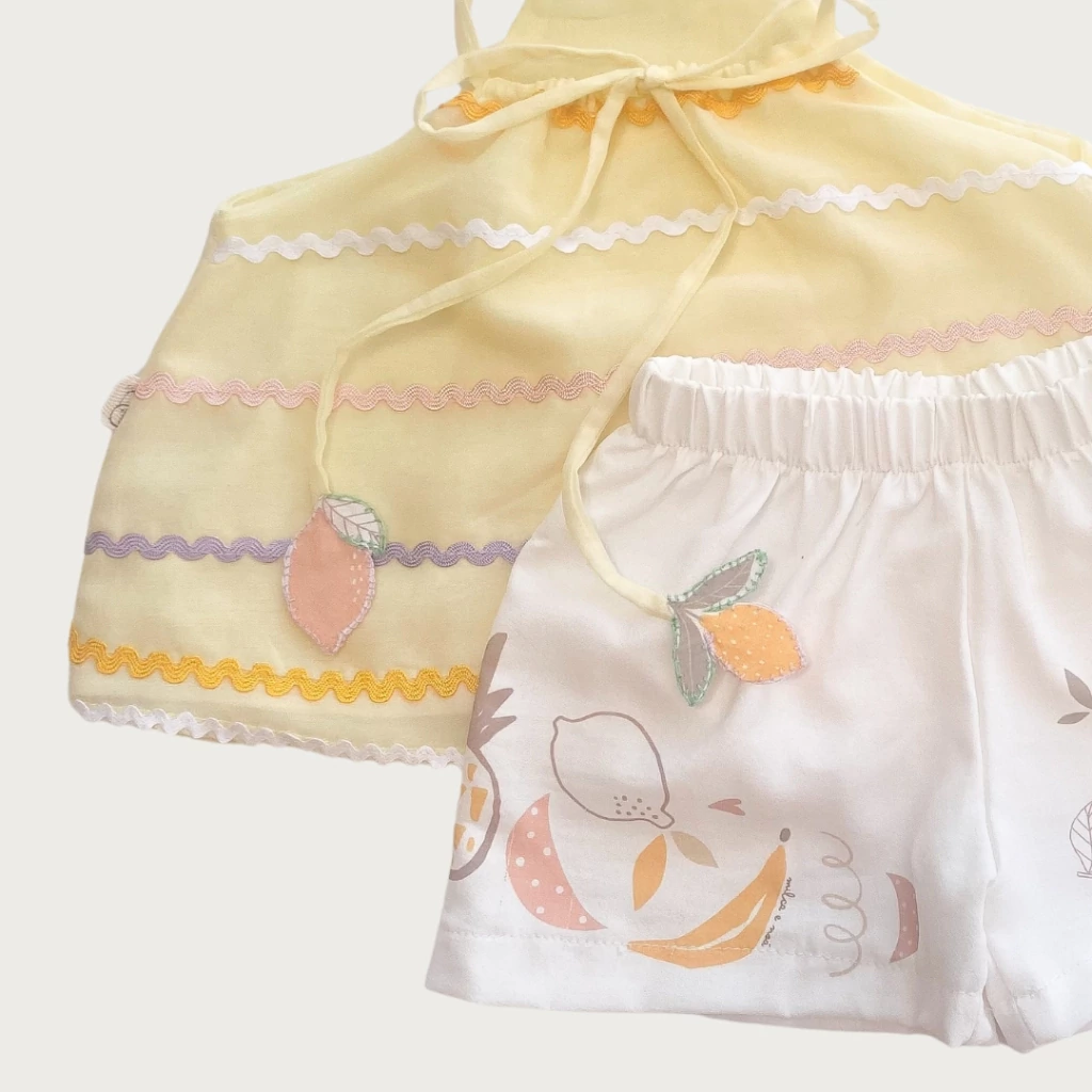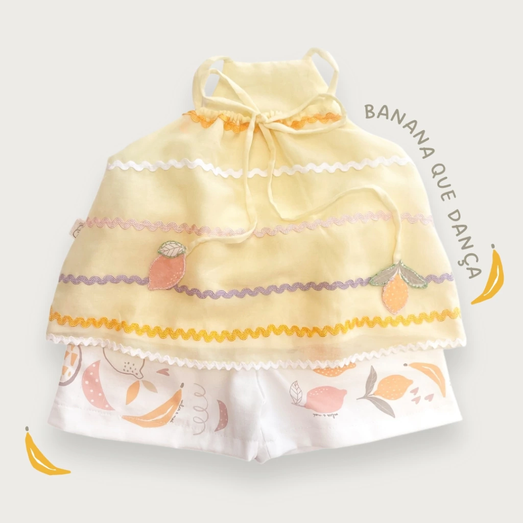 Inspirado no colorido das feiras de frutas, este conjunto celebra a infância com frescor, leveza e um toque artesanal que faz toda a diferença! 🍉🍋🍌🍓