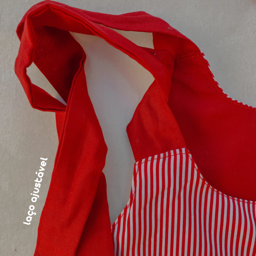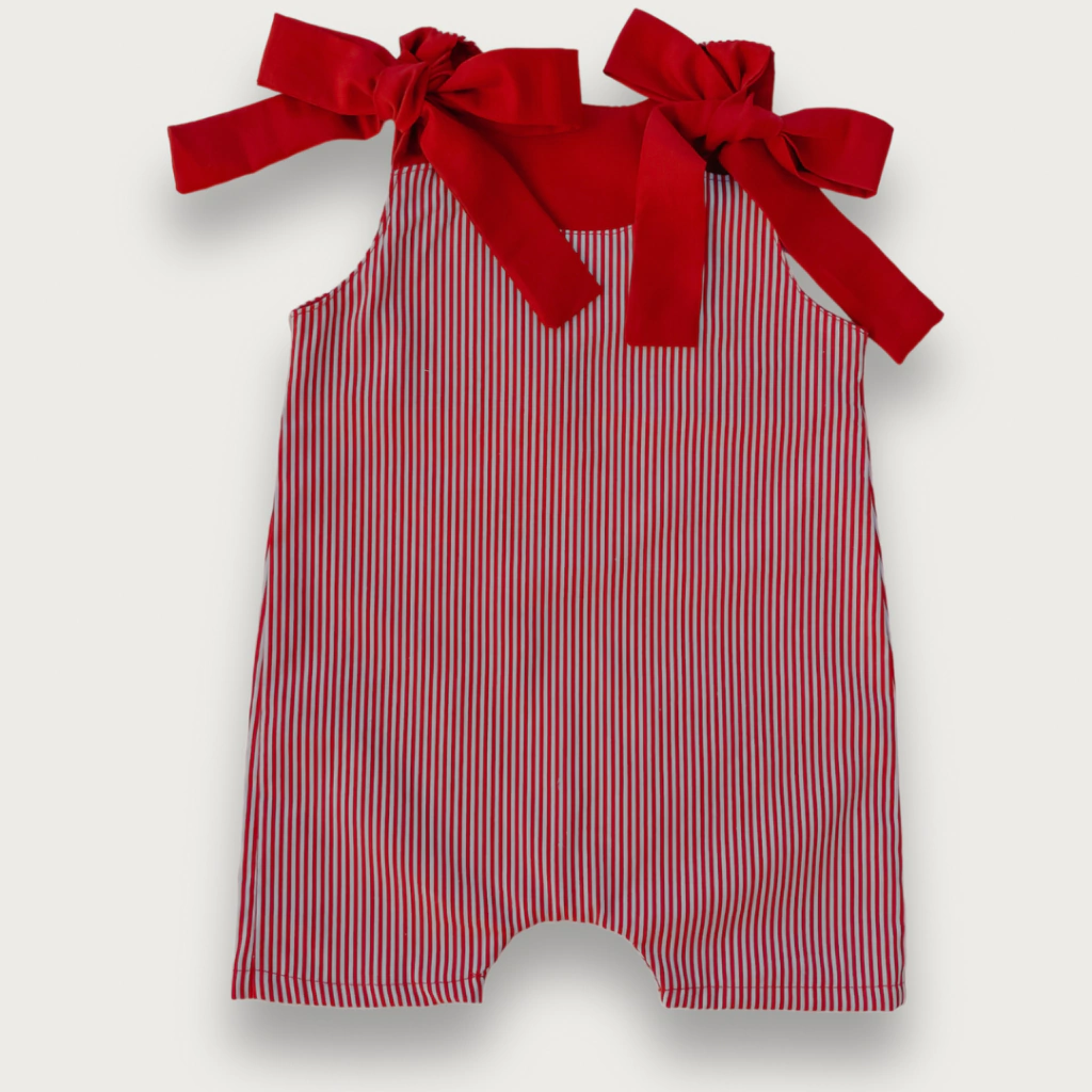 Jardineira com listrinnhas em branco e vermelho super charmosa.