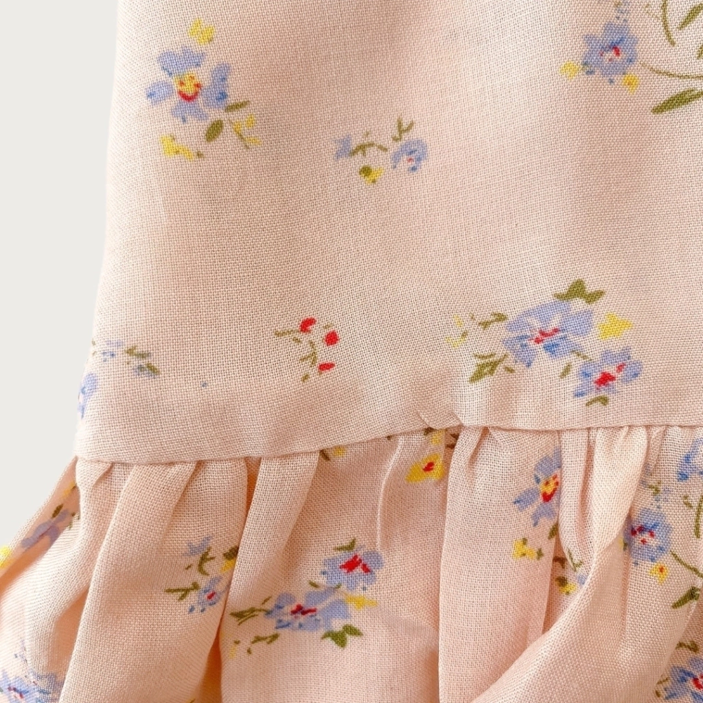 Com uma estampa de florzinhas vintage em fundo bege e tons pastéis, este vestido é pura leveza e romantismo. O destaque fica por conta do grande laço lavanda no decote, que adiciona um toque especial de elegância e ternura. Detalhes como o babado na barra, as mangas ajustáveis com elástico e o fechamento nas costas com botões cobertos à mão mostram o cuidado em cada ponto.