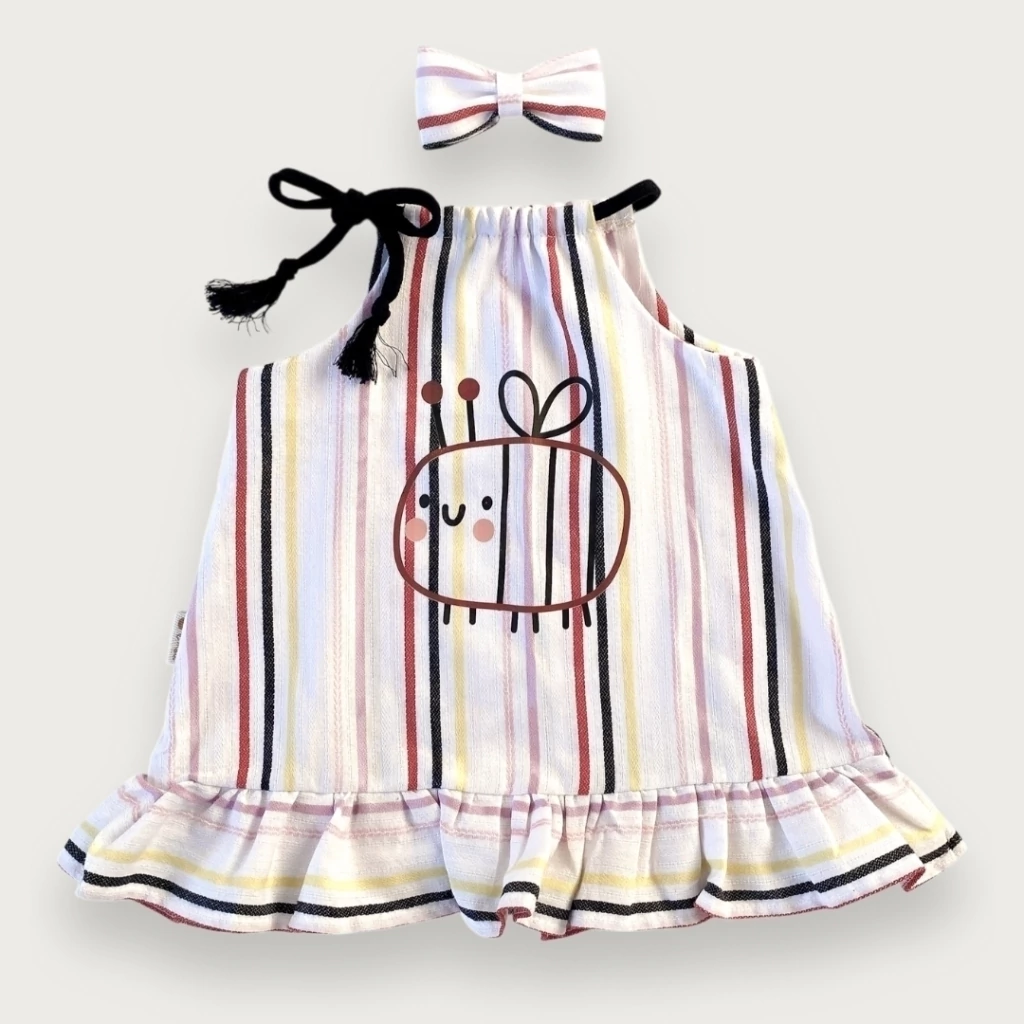 Inspirado nas cores alegres da infância e no encanto das pequenas abelhinhas, esse vestido em modelagem trapézio com babado foi feito para acompanhar o movimento doce de quem está descobrindo o mundo.