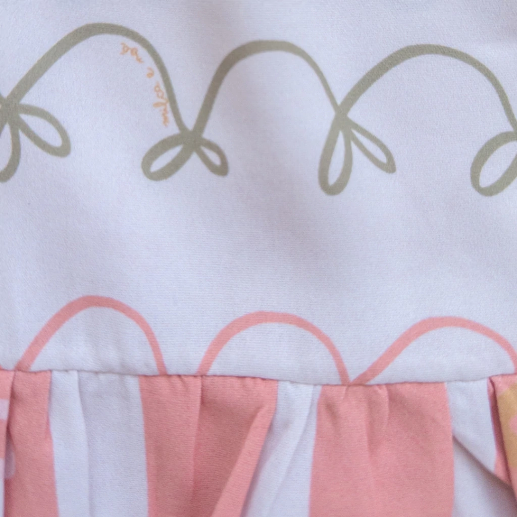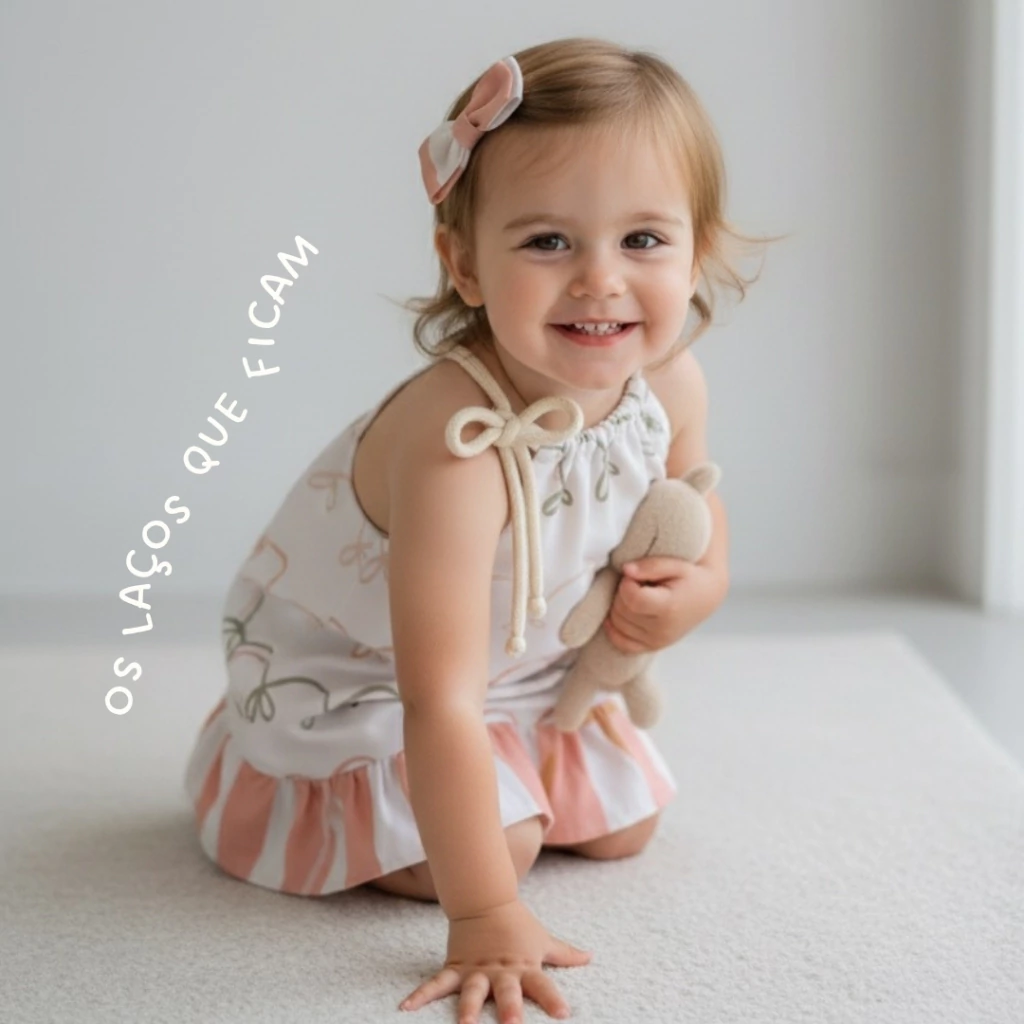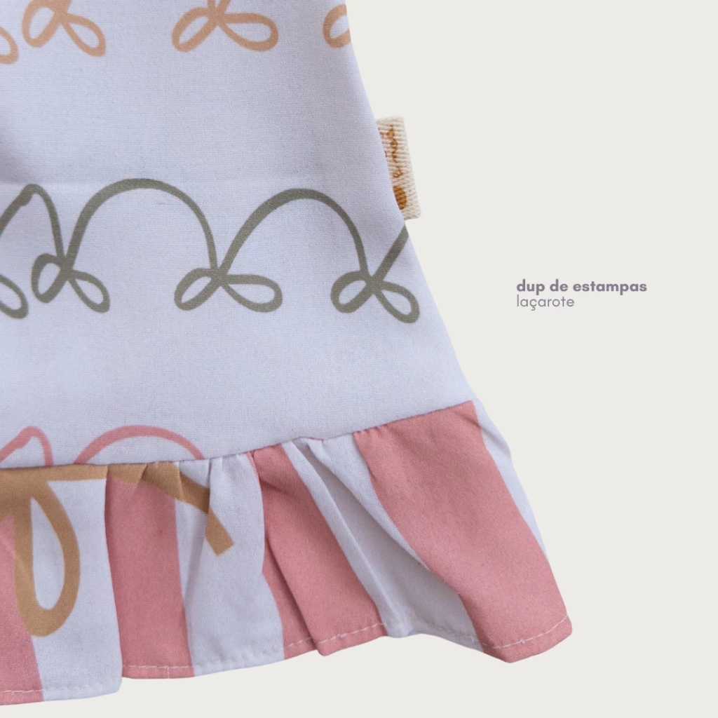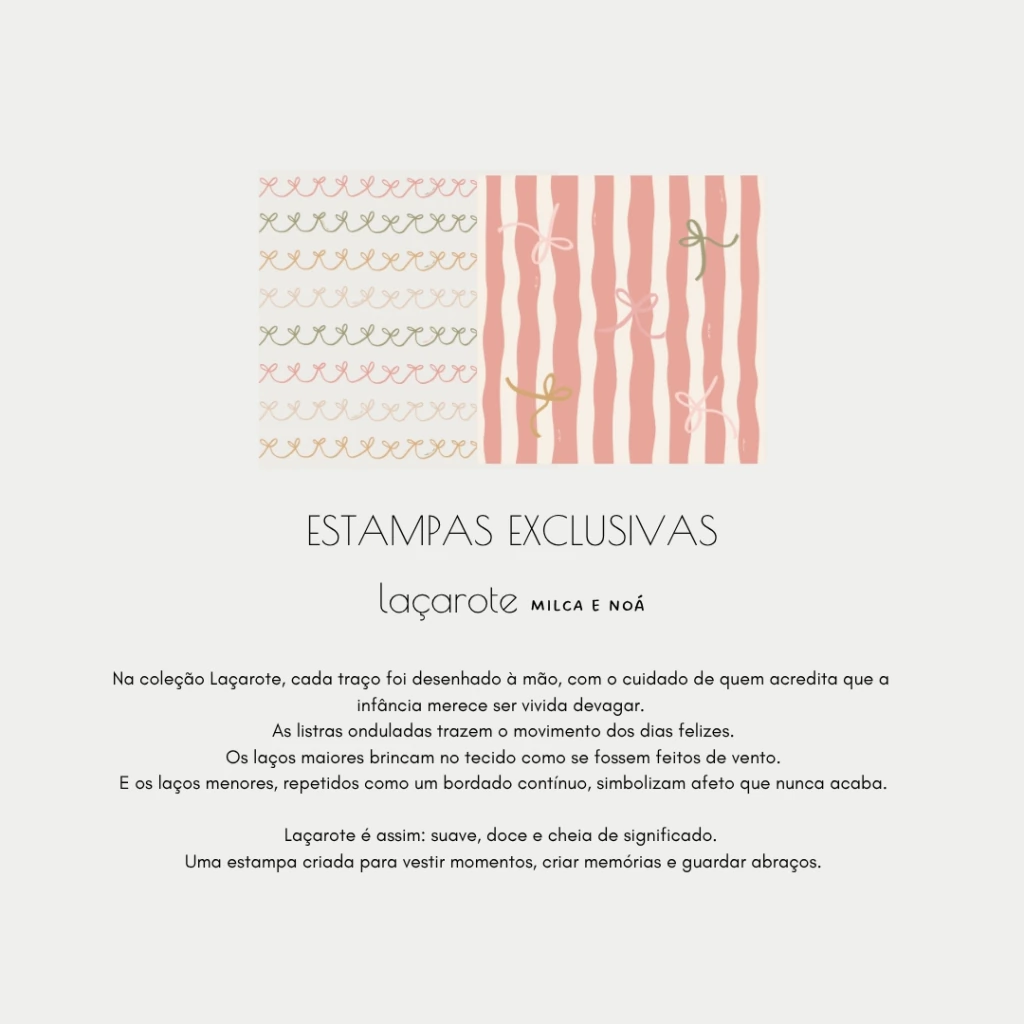 Ele combina os laços contínuos e delicados da estampa Fio-de-Laço com as listras poéticas da Laçarote Poético, criando um visual único, alegre e cheio de movimento.