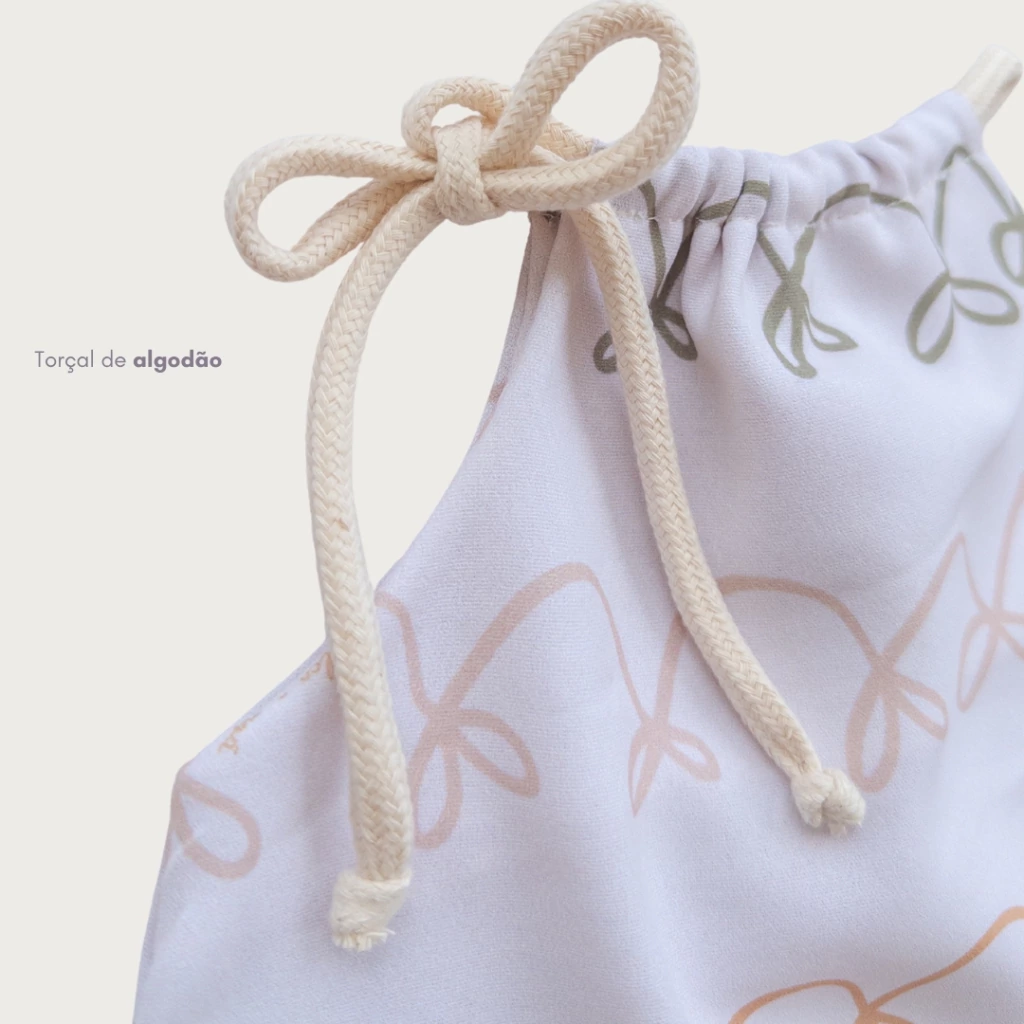 A amarração em cordão de algodão cru traz charme e praticidade, permitindo ajustar o decote com delicadeza.