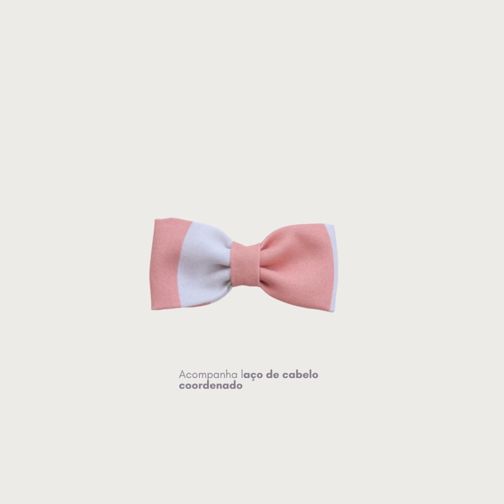 Para finalizar, acompanha um lacinho combinando, deixando o look ainda mais harmonioso e doce.