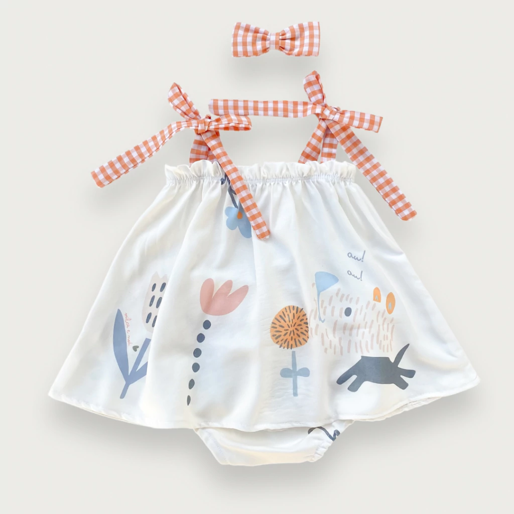Com uma modelagem soltinha estilo saiote, o vestido garante a liberdade que as pequenas precisam para brincar e explorar o dia todo. As alcinhas com lacinho ajustável dão o toque delicado, permitindo um ajuste perfeito e muito estilo. E, para completar o visual, o conjunto vem com calcinha e lacinho de cabelo, combinando perfeitamente para um look fofo e prático.